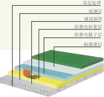 面漆層 | 輥涂或噴涂環(huán)氧防靜電面涂材料 | 防靜電環(huán)氧面漆 | — | 0.20~0.30kg/m2 |