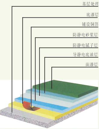 面漆層 | 用導(dǎo)靜電自流平鏝刮一遍,用消泡滾筒消泡 | 導(dǎo)靜電自流平面漆 | — | 0.8~1.00kg/m2 |